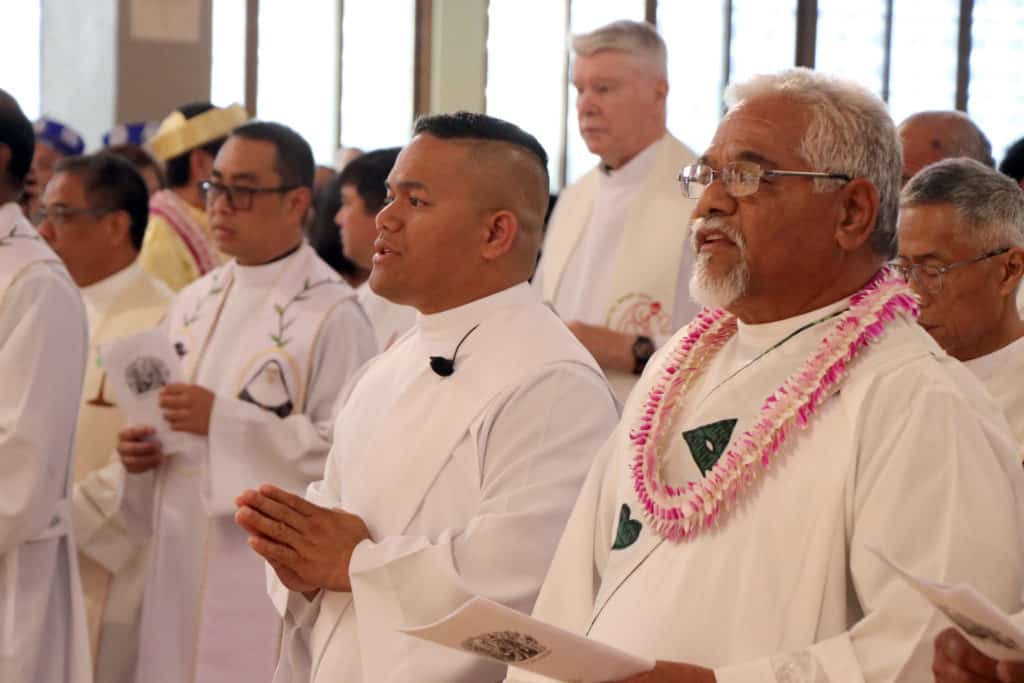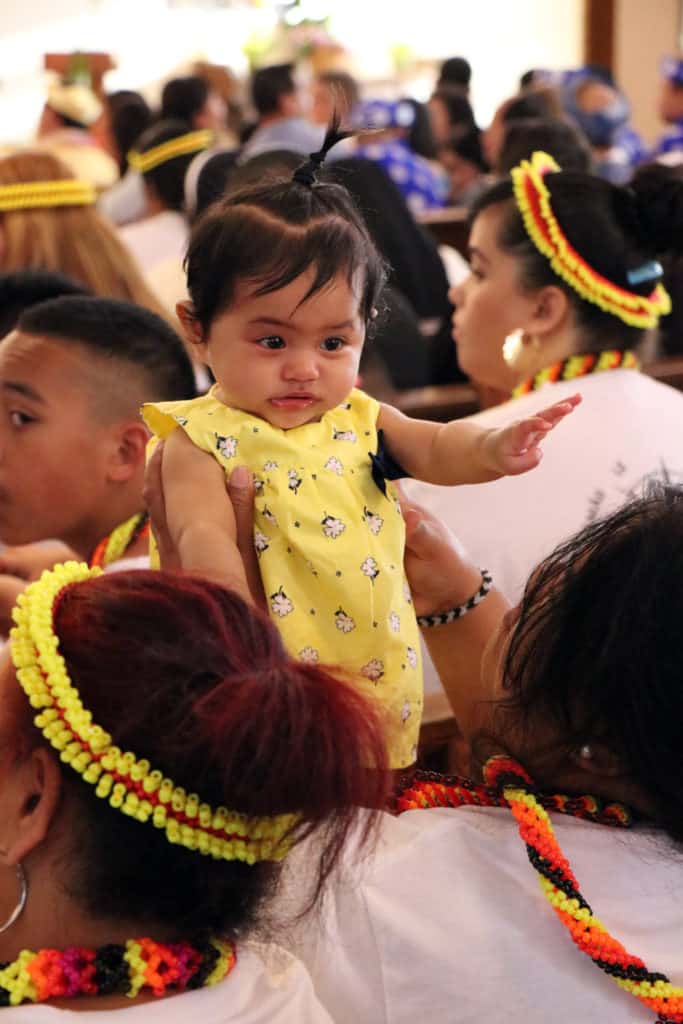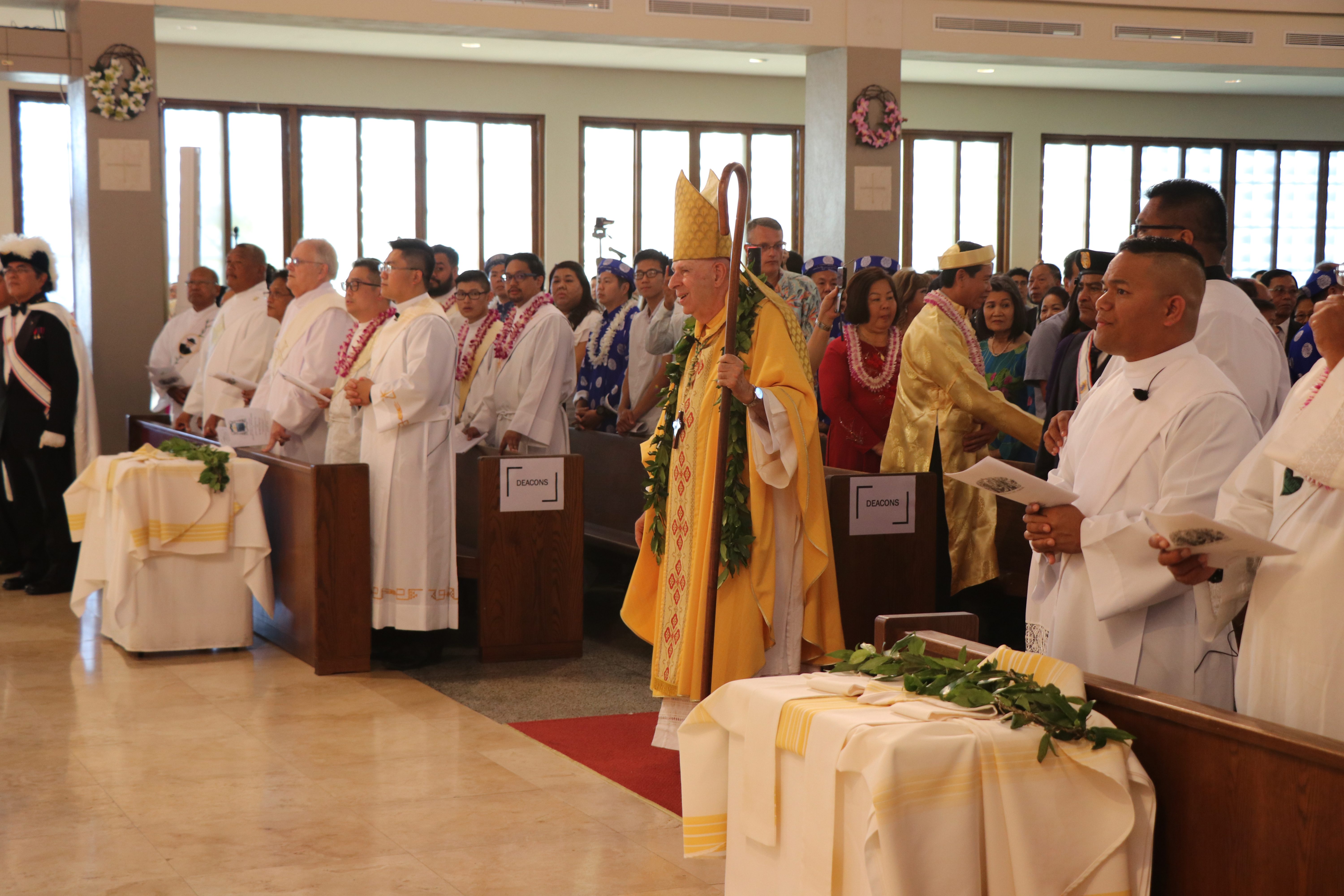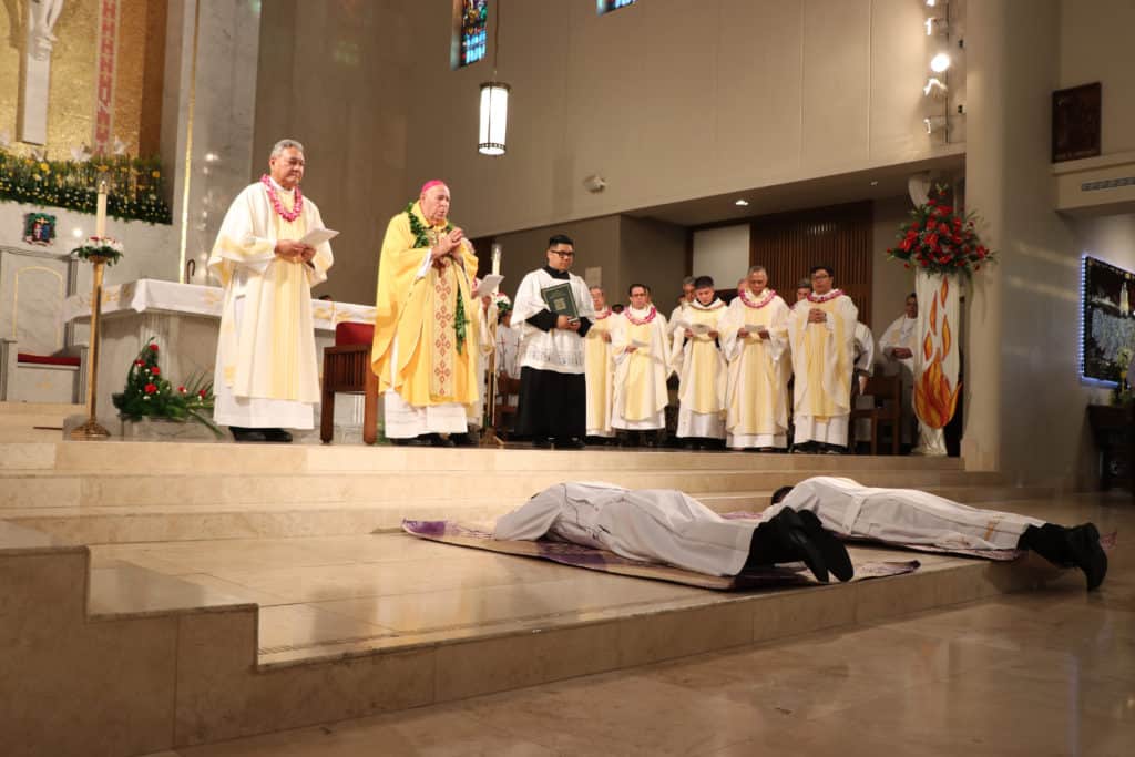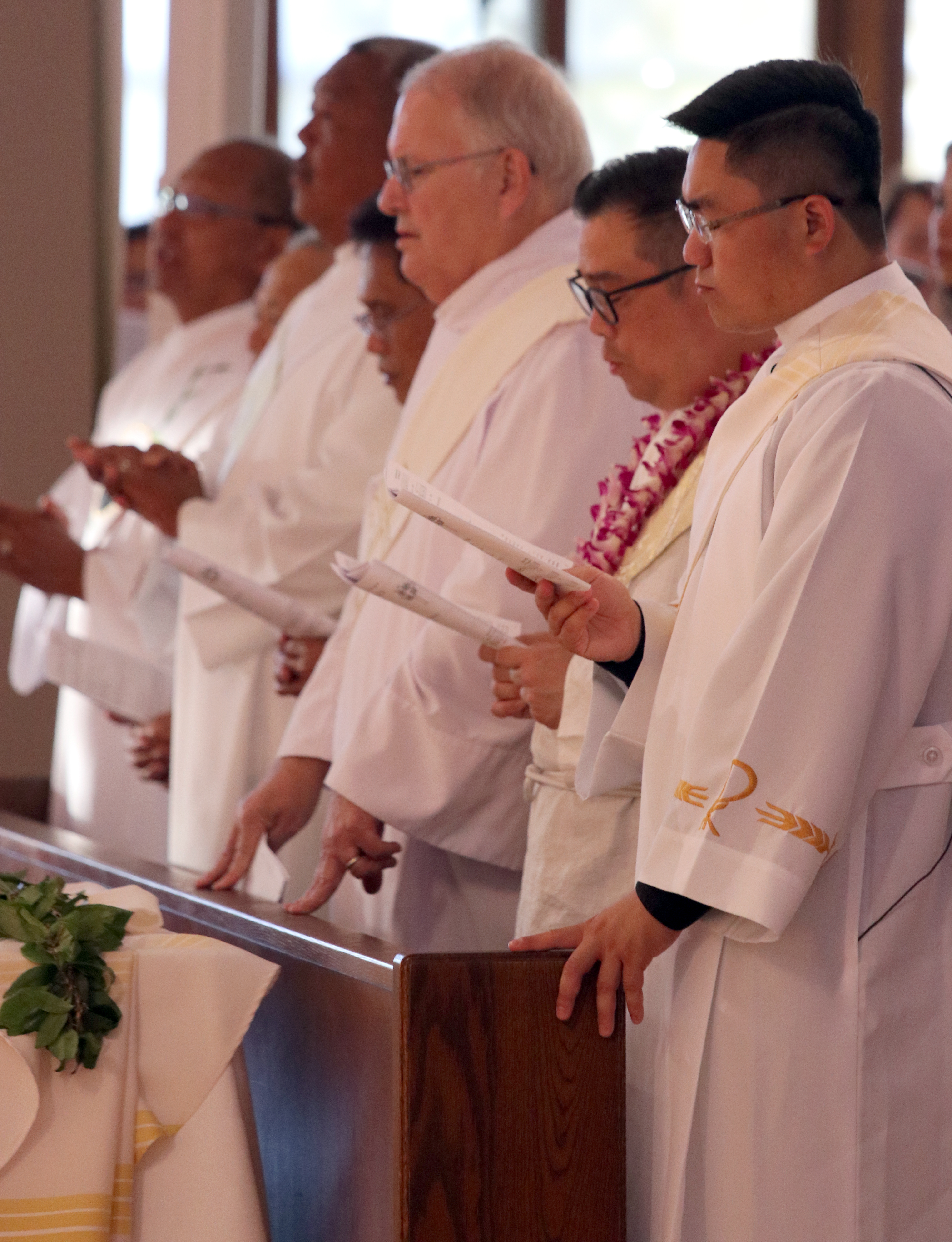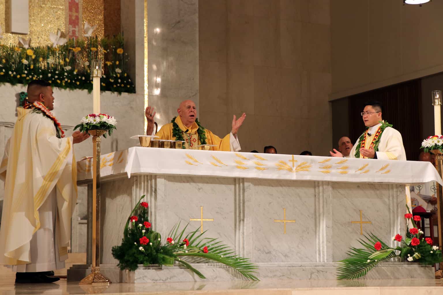 Bishop Silva then anointed their hands with holy Chrism, carried in a calabash carved from the wood of the Islands’ first kiawe tree, planted by Hawaii’s first Catholic missionaries.