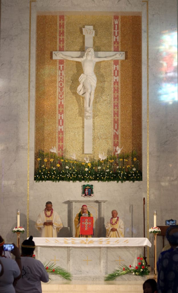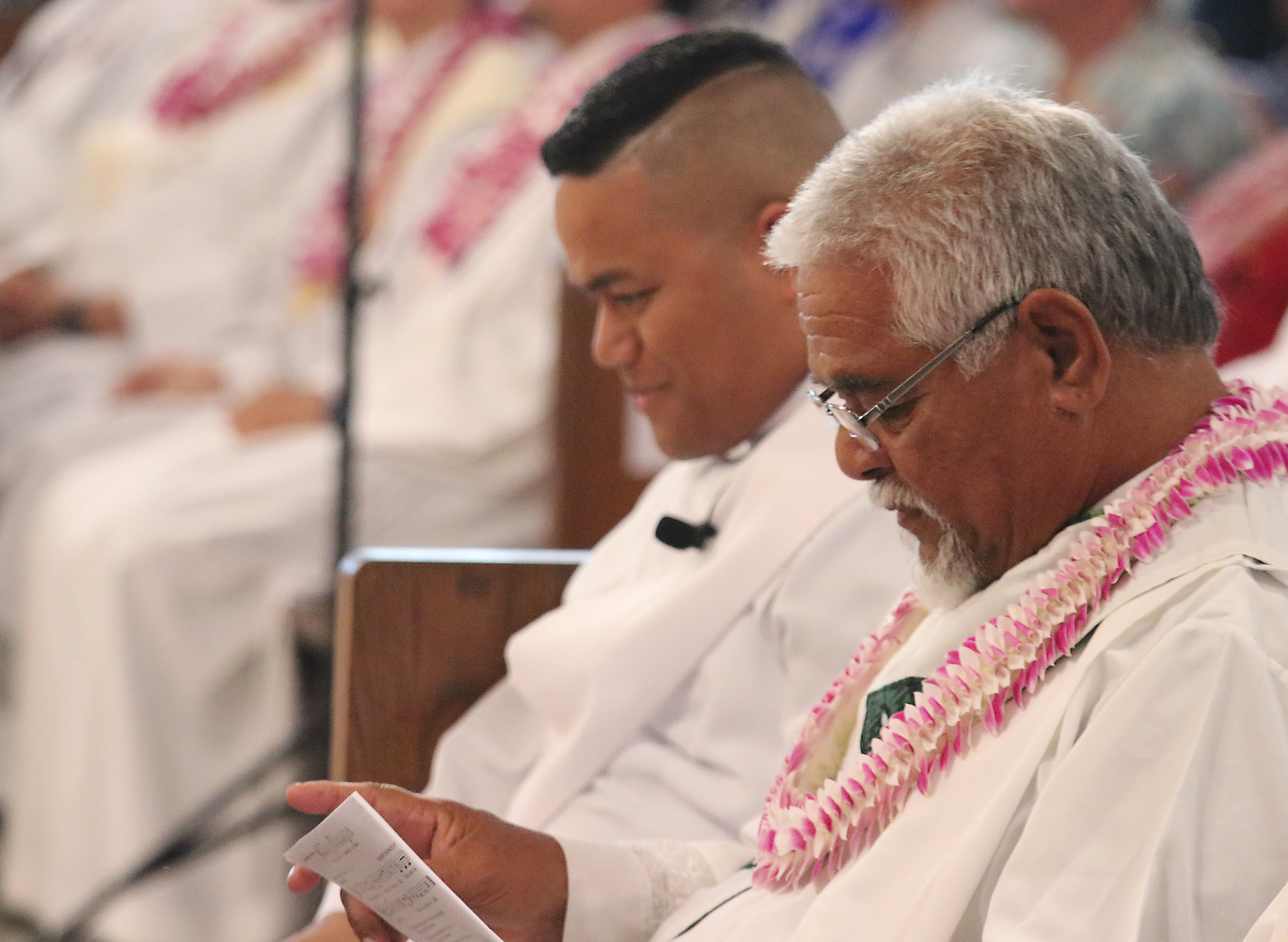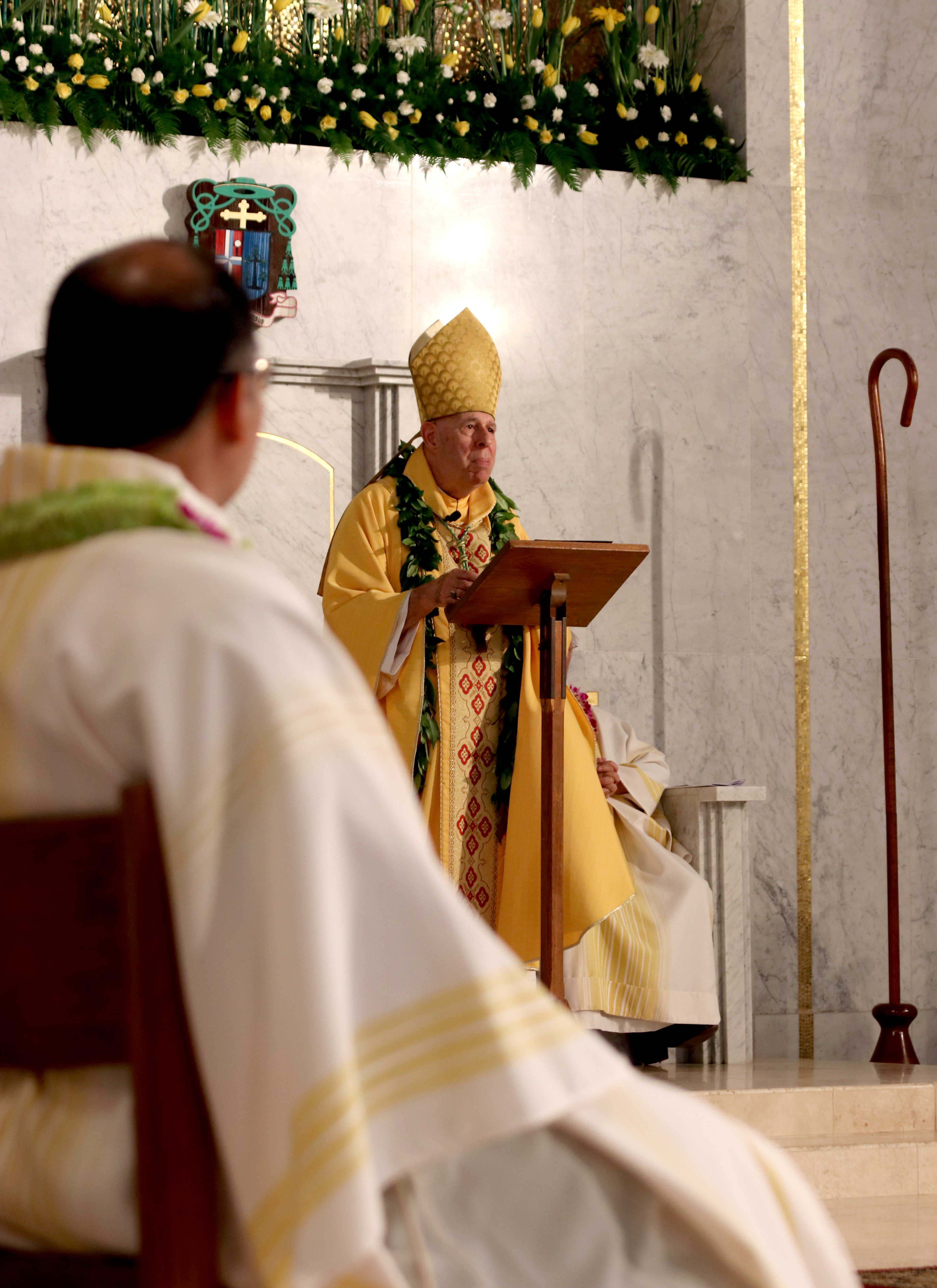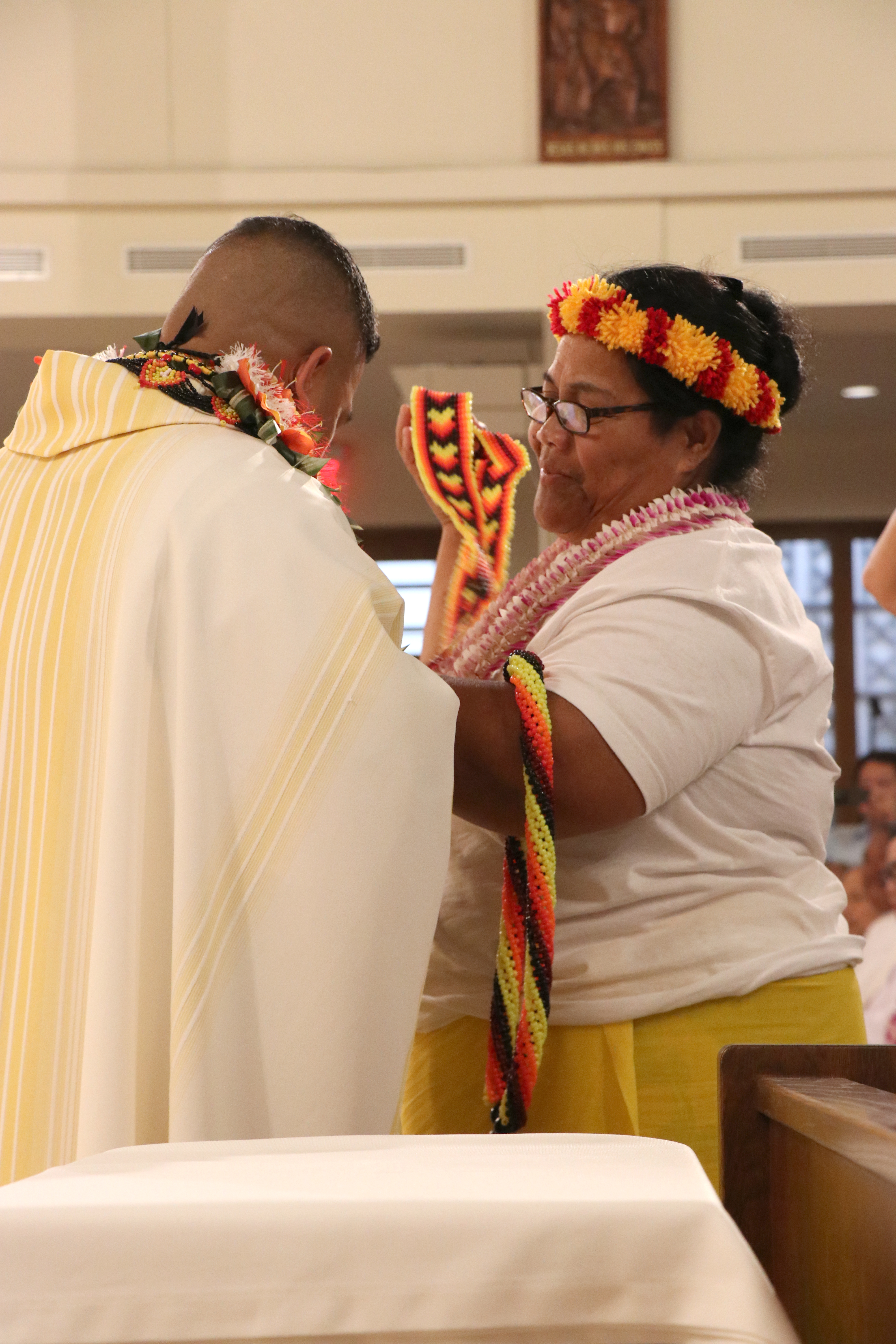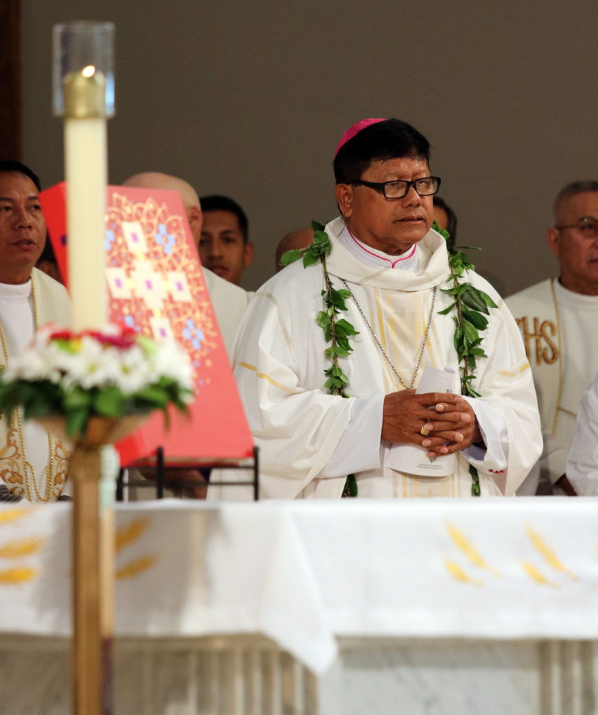 Bishop Silva then anointed their hands with holy Chrism, carried in a calabash carved from the wood of the Islands’ first kiawe tree, planted by Hawaii’s first Catholic missionaries.