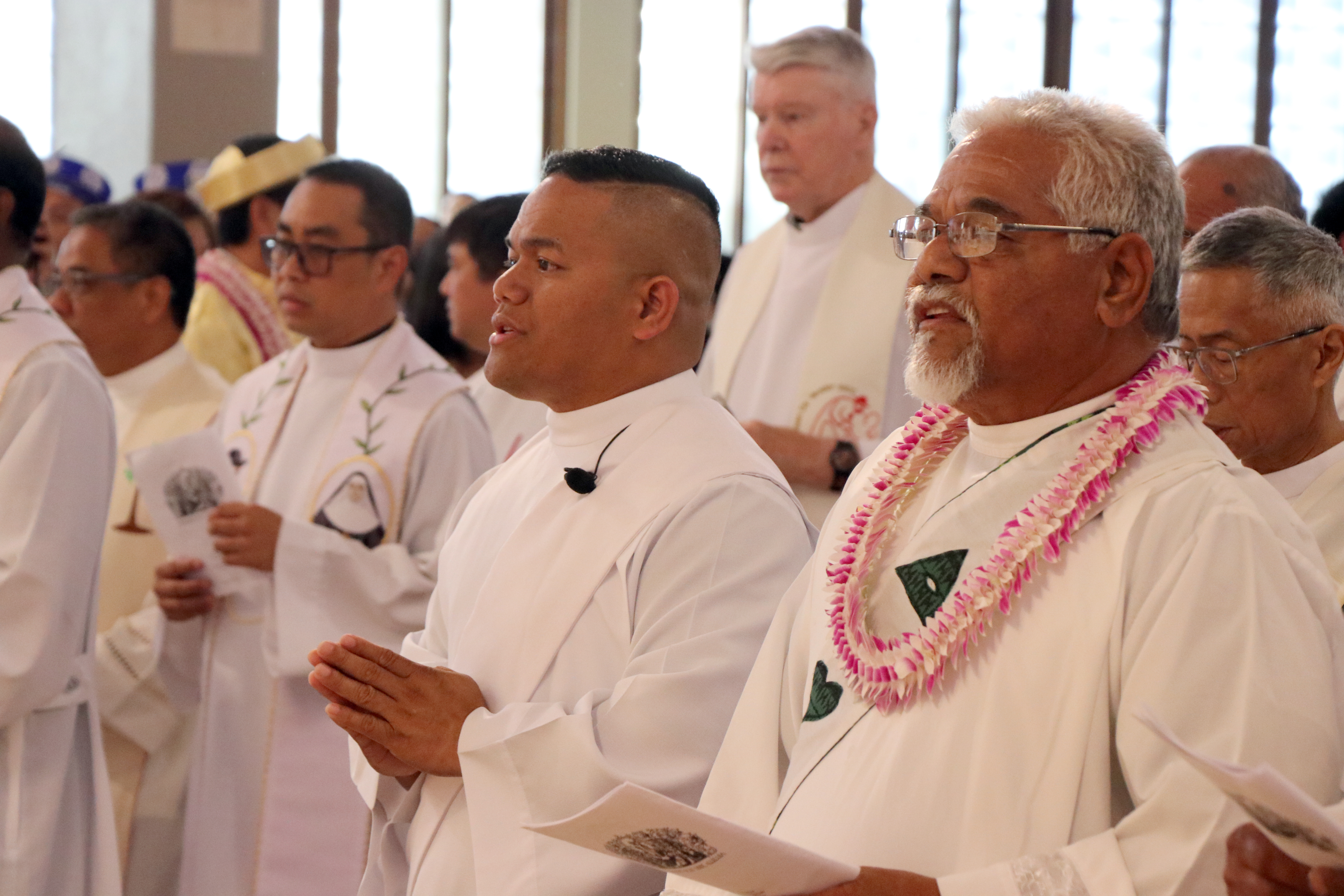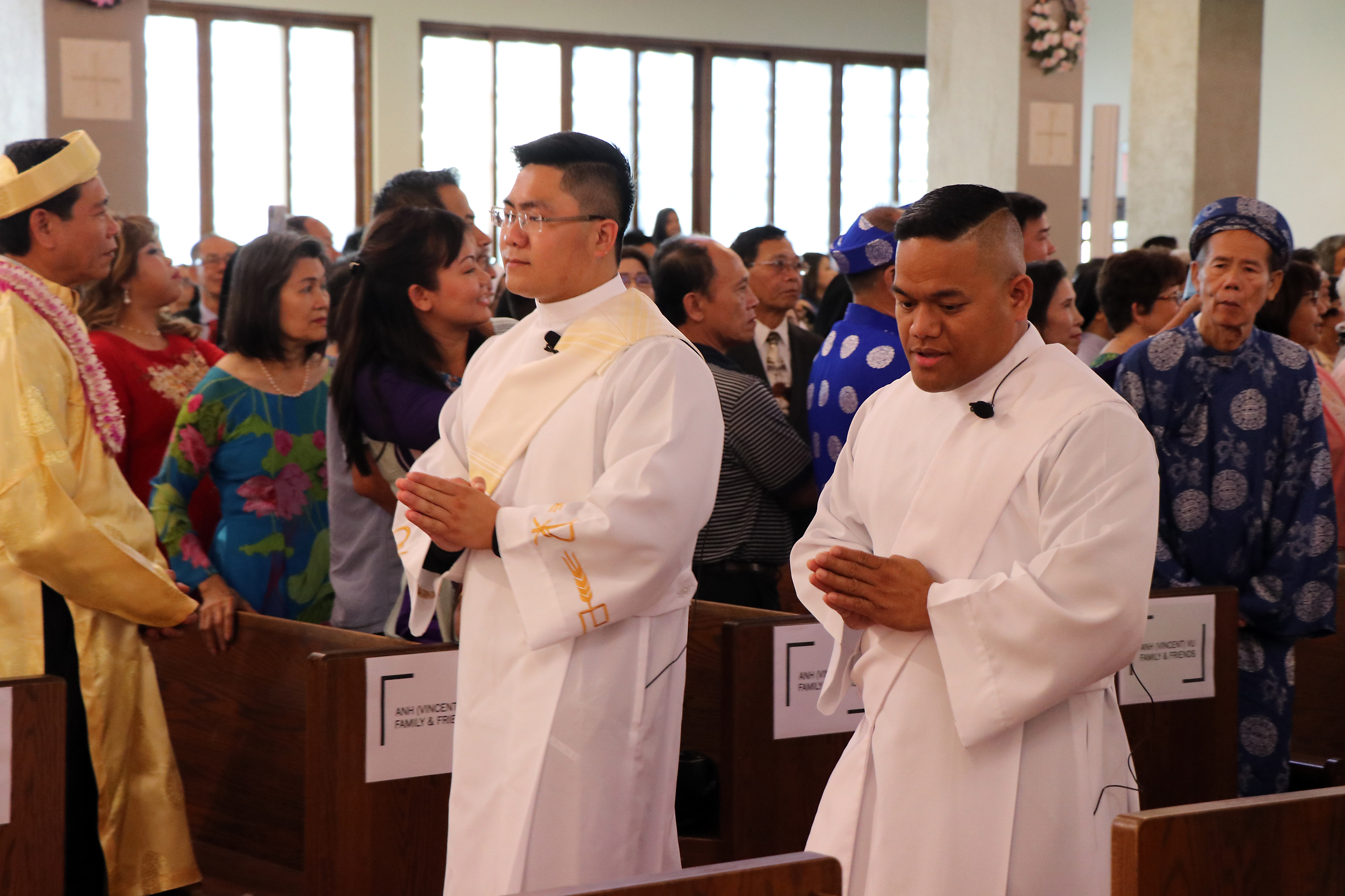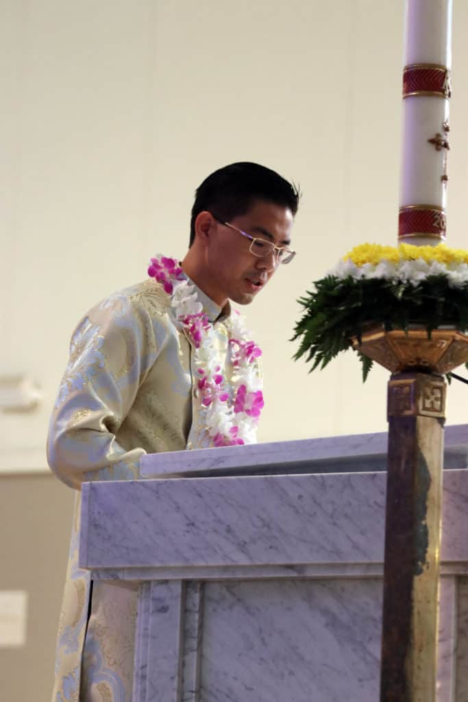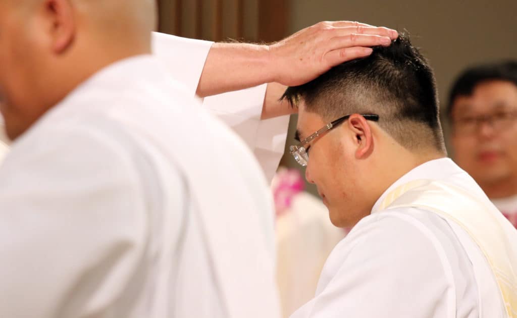 The bishop asked the priest candidates if they were worthy. Assured that they were, he said, “Relying on the help of the Lord God and our Savior Jesus Christ, we choose Ahn and Romple, our brothers, for the order of the priesthood.”