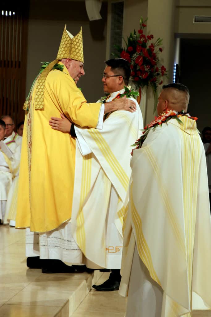 The symbolic rituals of ordination completed, the bishop sealed the rite with the fraternal kiss of peace, a full two-armed embrace of each, to another round of applause and cheering. The concelebrating priests followed suit, some exchanging smiles and brief words, some kissing the new priests’ hands.