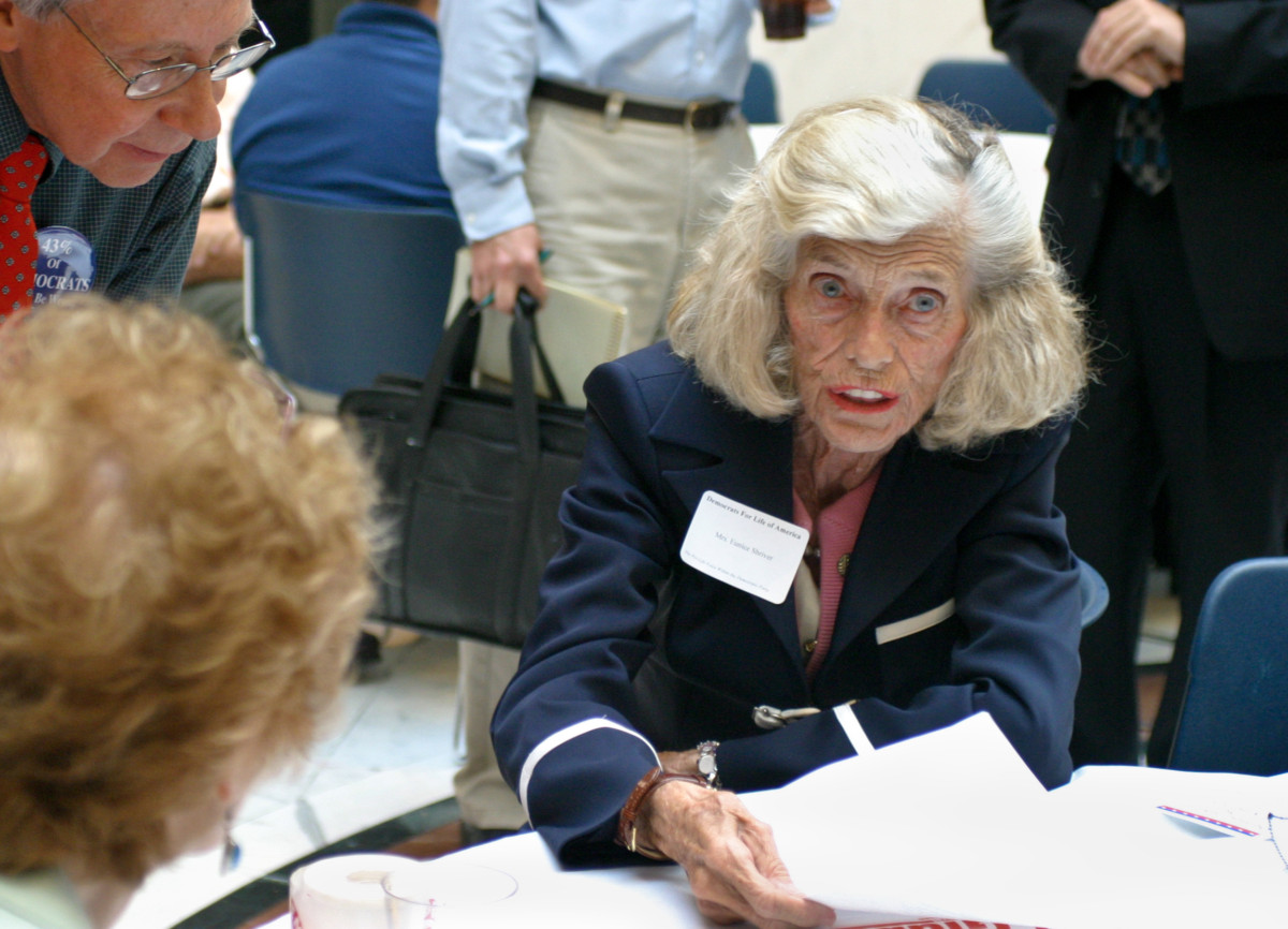 Eunice Kennedy Shriver attends a meeting of Democrats for Life at the Massachusetts Statehouse during the 2004 Democratic National Convention in Boston. Shriver, who founded the Special Olympics and was a member of one of the most prominent American Catholic political families of the 20th century, died Aug. 11 at age 88 in a hospital in Barnstable, Mass., on Cape Cod. (CNS photo/Gregory L. Tracy, Pilot) (Aug. 11, 2009) See OBIT-SHRIVER (UPDATED) Aug. 11, 2009.