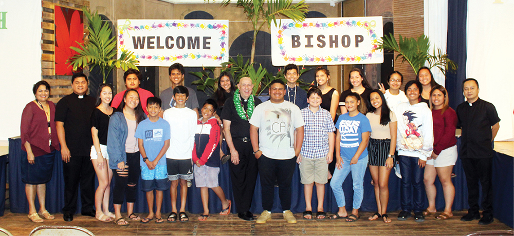 Parish youth leaders of St. Joseph Parish in Makawao gather for a photo with Bishop Larry Silva April 6 during his episcopal visit April 6-7 to the Maui parish. On Saturday, the bishop enjoyed a dinner and meeting with the more than a dozen ministry leaders. On Sunday, the bishop confirmed 27 students. After Mass he presided over a parish town hall meeting and met with the youth and young adult ministries. Bishop Silva welcomed questions and encouraged parishioners to share their hopes and concerns. The bishop ended his visit with a relaxed lunch with the youth. (Photo courtesy of Helen Souza)