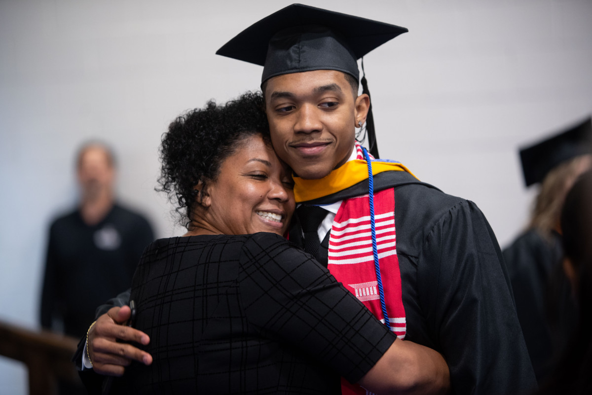 A graduate is embraced following Notre Dame College’s 2019 commencement ceremony in South Euclid, Ohio, May 19. College graduations often include an encouraging push by commencement speakers for graduates to go out and make a difference in the world. (CNS photo/Doug Garmon, courtesy Notre Dame College)