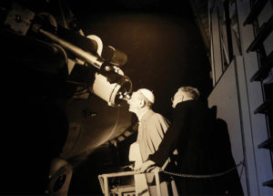 Pope Paul VI views the moon through the viewfinder of the Schmidt telescope at the time of the first landing on the moon, July 20, 1969. This print was photographed on display at the Vatican observatory in Castel Gandolfo, Italy, Sept. 28, 2018. (CNS photo/Paul Haring)