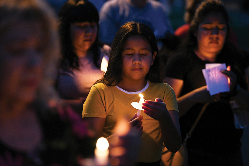 Mourners in Brownsville, Texas, honor the lives of Salvadoran migrant Oscar Alberto Martinez Ramirez and his 23 month-old daughter, Valeria, at a June 30 vigil. (CNS photo/Loren Elliott, Reuters)