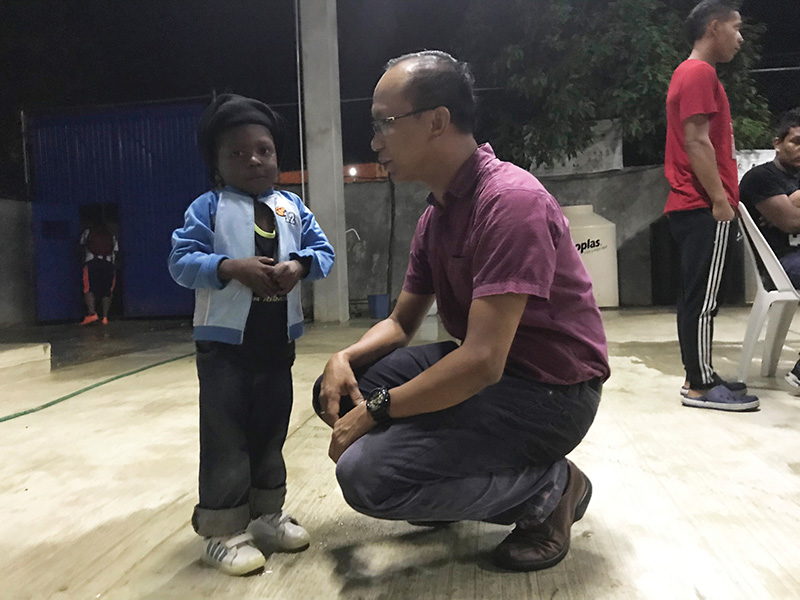 Divine Word Father Jeffrey Yague Udasco speaks with a migrant boy from Honduras at a shelter for migrants in Salto de Agua, Mexico, June 28. Local police entered the shelter in June without permission, part of a pattern of harassment against groups who protect migrants passing through Mexico. (CNS photo/David Agren)