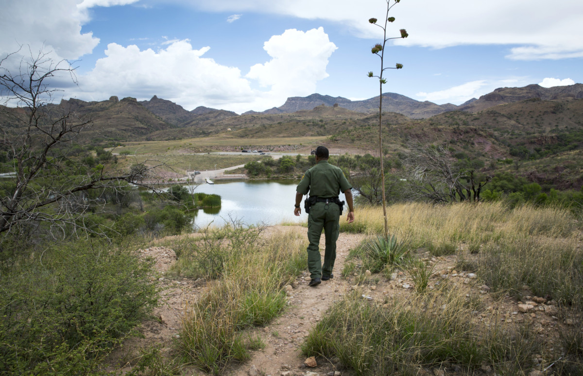 Border Patrol Agent Bryan Flowers walks above Pena Blanca Lake, a small recreation area about 17 miles northwest of Nogales, Ariz., July 16, 2014. Because of the water availability, smuggling routes through this region are common, Flowers said. (CNS photo/Nancy Wiechec)