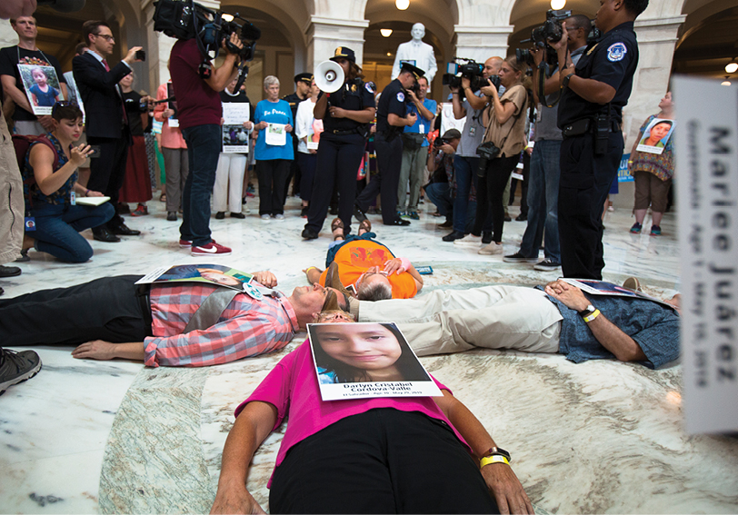 Catholic leaders and advocates lay on the floor of the Russell Senate Office Building in Washington July 18, 2019, to protest the Trump administration’s handling of detained immigrant children. (CNS photo/Tyler Orsburn)