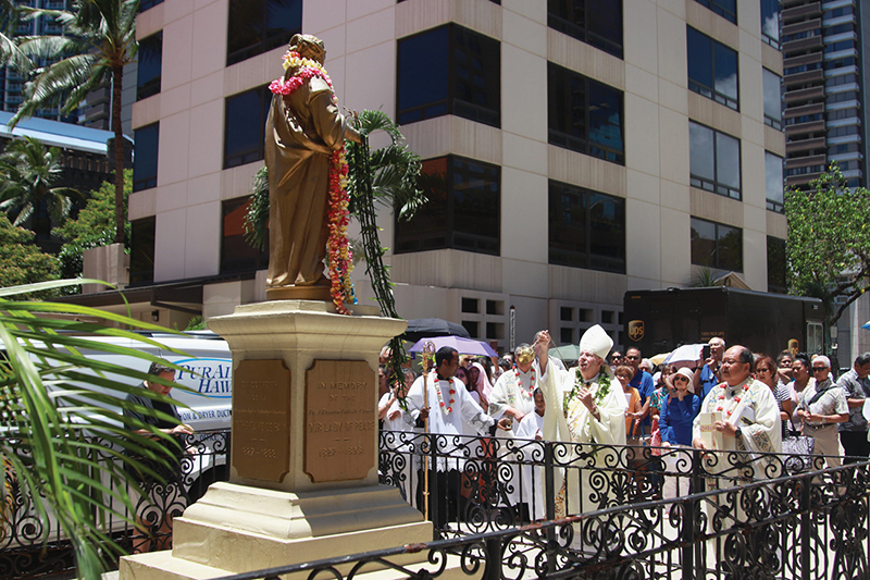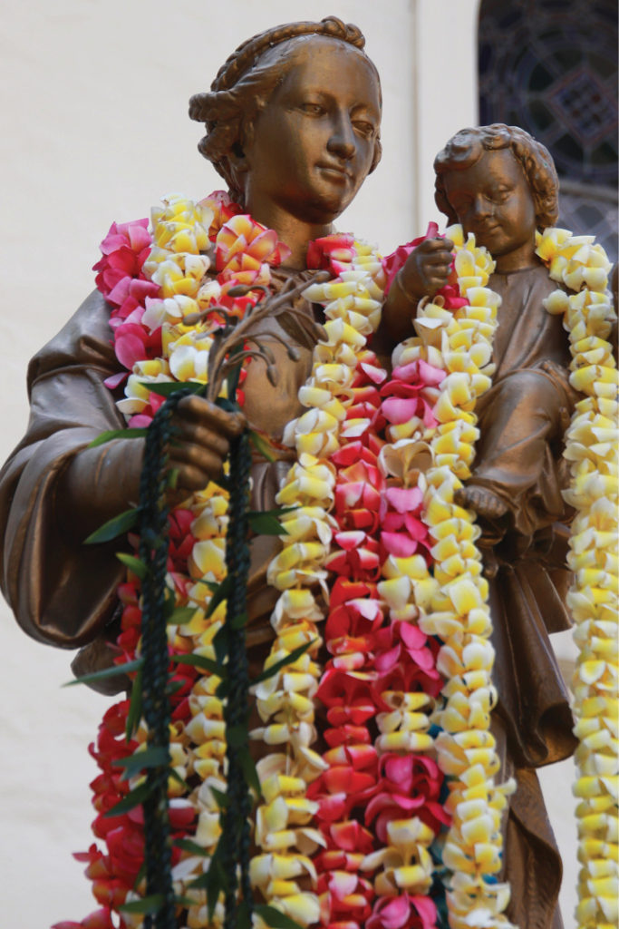 Above, Bishop Larry Silva blesses with incense the statue of Our Lady of Peace outside the cathedral basilica that bears her name July 9 after a Mass inside the church celebrating the feast of Our Lady of Peace. Mary, under the title of Our Lady of Peace, is the patroness of the Diocese of Honolulu. The building in the back is the diocesan chancery. She is also the patroness of the Congregation of the Sacred Hearts of Jesus and Mary, the French order that brought the Catholic faith to Hawaii. Her statue, left, is covered with leis for her celebration. (Photos courtesy of Dann Ebina)