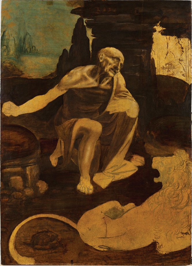 The saint’s gaze is to the side corner in the direction of a sketched crucifix. Behind him, on the upper left, is a faded landscape that upon a closer look is said to reveal da Vinci’s fingerprints.