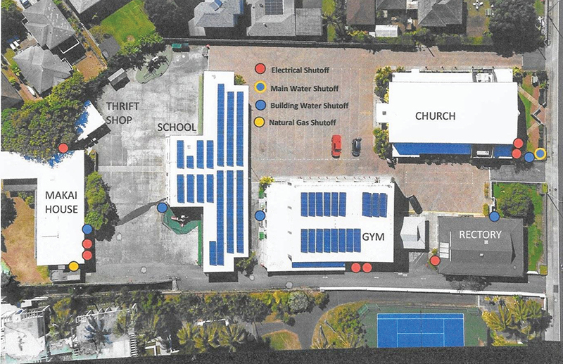 Representatives from the Honolulu Fire and Police Departments visited our campus and walked our location, offering recommendations. Our maintenance team provided a site map with photos identifying water, electric and gas shut-off controls, in the event they are needed by emergency personnel.