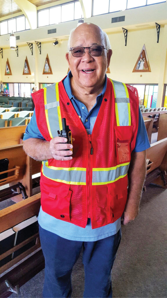Usher Dennis Lock with two-way radio and emergency vest. (Photo courtesy of Holy Trinity Church)