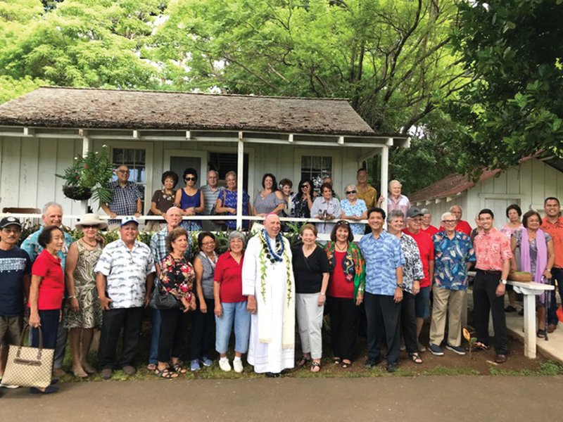 Bishop Larry Silva poses with a group of other persons of Portuguese ancestry in front of the renovated two-bedroom Portuguese plantation house at Hawaii Plantation Village in Waipahu that he blessed Aug. 9. The house, modeled after the plantation homes at Poamoho Camp on Oahu, would have statues of the Sacred Heart of Jesus and a good luck rooster, a sewing machine, doilies and a rocking chair among other typical furnishings. (Photo courtesy of Willetta Centeio)