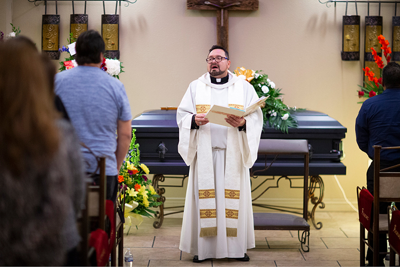 Father Fabian Marquez is seen during Andre Pablo Anchondo’s vigil service at Perches Funeral Home in El Paso, Texas, Aug. 15, 2019. Anchondo died along with his wife Aug. 3 as they protected their 2-month-old baby from the mass gunman at Walmart. Achondo was buried the next day following his funeral Mass celebrated by Father Marquez. (CNS photo/Ivan Pierre Aguirre)