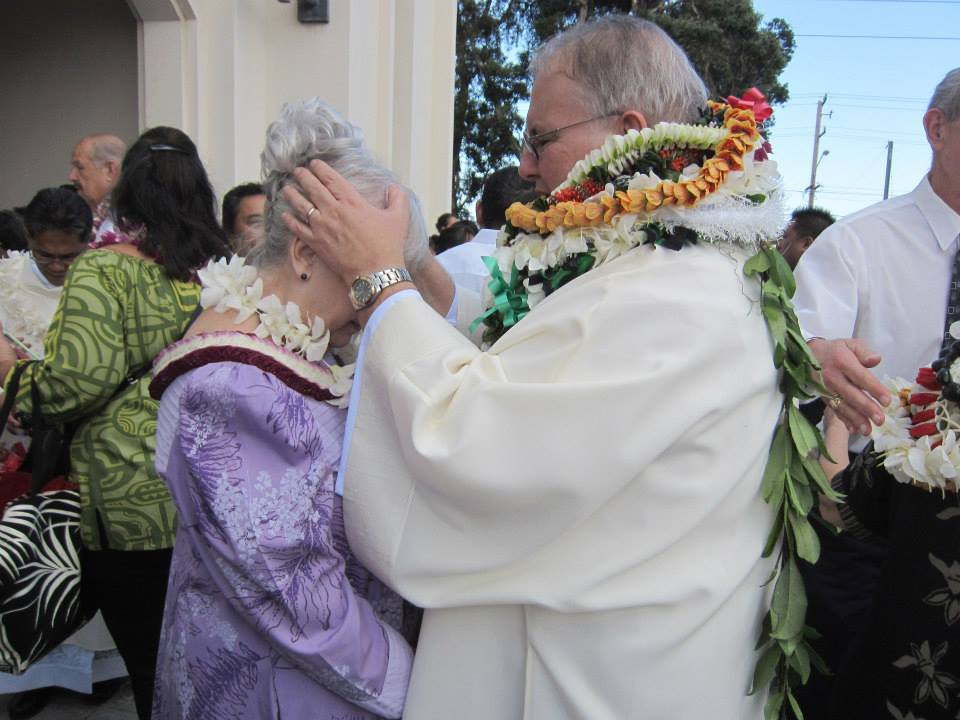 Deacon Michael Weaver gives one of his first blessings as a deacon to Kathy Coughlin, co-director of the deacon formation program in the Diocese of Honolulu, after his diaconate ordination on Jan. 31, 2015. (Photo: A.Weaver)