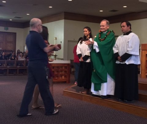 Raina and Matt bring up the gifts to Father Richard McNally during this year’s Ohana Mass at St. Ann Church in Kaneohe. (Photo courtesy: Office for Social Ministry)