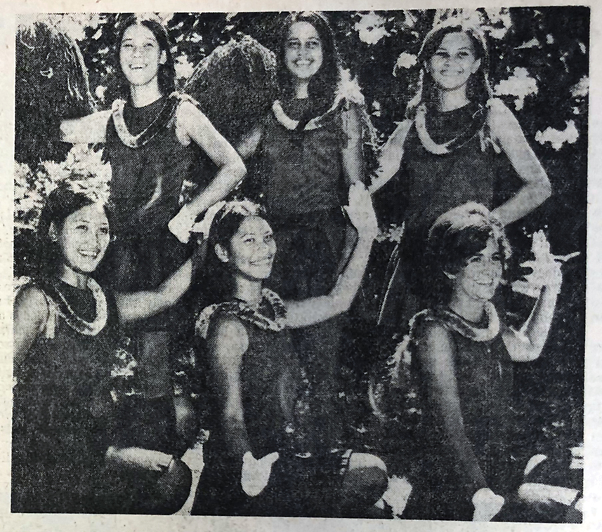 ST. LOUIS’ SONGLEADERS — Whether winning or losing, songleaders add much to the enjoyment of any football game. Some of the members of the St. Louis Songleaders are pictured above: (back row, left to right) LaVerne Lum, Aileen Stillman; (front row, left to right) Liane Saffery, Archie Lovell, and Toni Costa.