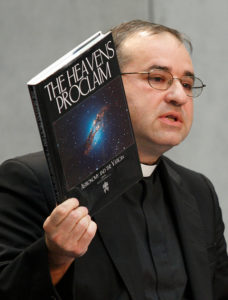 Jesuit Father Jose Funes, then-director of the Vatican Observatory, holds up “The Heavens Proclaim,” during a press conference at the Vatican Oct. 13. (CNS/Paul Haring)