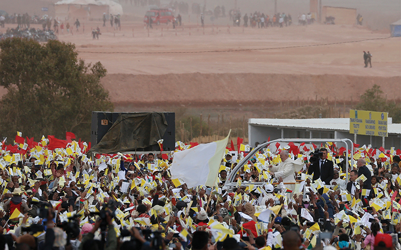 Pope Francis greets the crowd before celebrating Mass at the Soamandrakizay diocesan field in Antananarivo, Madagascar, Sept. 8. (CNS photo by Paul Haring)