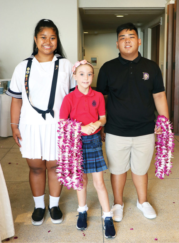 Representing the PWH Scholars on Sept. 26 were Damien Memorial School sophomore Shayden DelaCruz and Sacred Hearts Academy junior Yokiko Techuo. St. Anthony School, Kailua, second grader Audrey Peterson helped greet attendees as well.