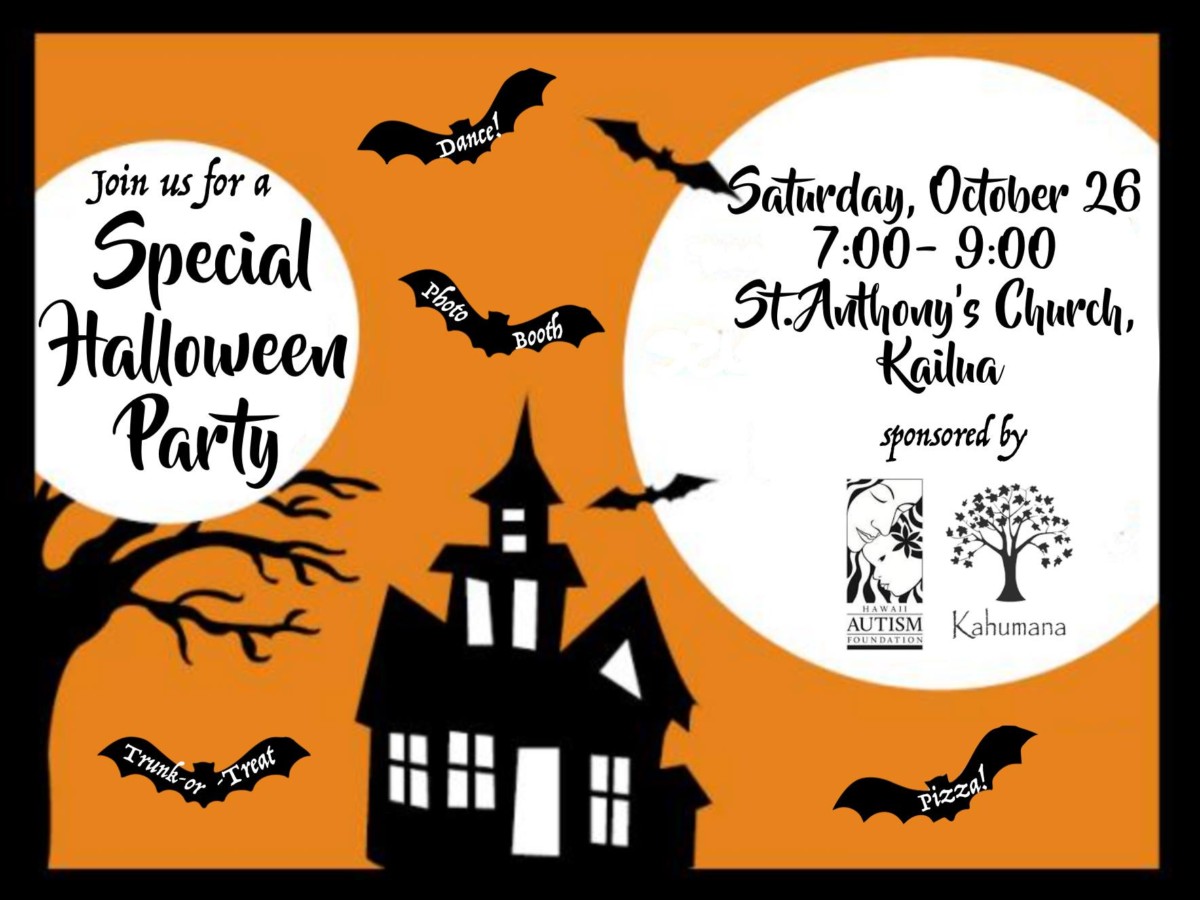 St. Anthony Church in Kailua, at 148 Makawao Street, is hosting the Kahumana Learning Center’s Special Halloween Party, 7-9 p.m., Oct. 26, an annual event for teens and young adults with autism and other developmental and intellectual disabilities.