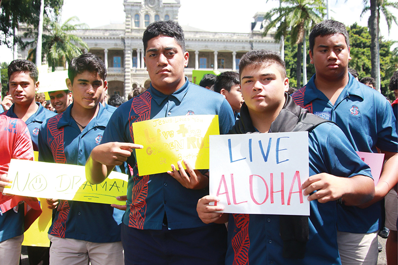 Oct. 3 in downtown Honolulu. They were among the hundreds who participated in the annual event, which began this year with a remembrance of nine Hawaii victims killed by domestic violence. The march through downtown started and ended at Iolani Palace where a rally was held. Students from Damien Memorial School and Chaminade University also participated. (Photo courtesy of Dann Ebina)