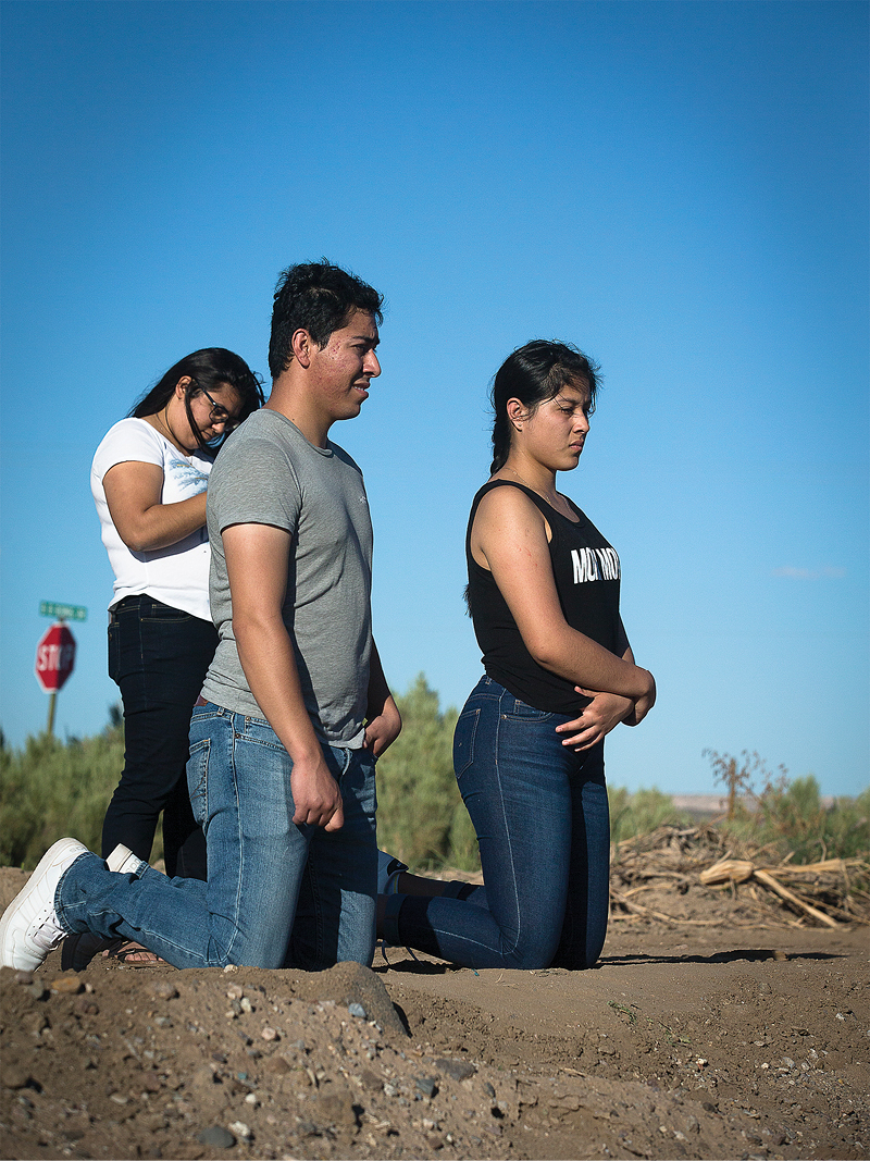 Farmworkers kneel in prayer during an outdoor Mass Sept. 26 in Hatch, N.M., part of a pastoral encounter by U.S. bishops with migrants at the border. (CNS photo/Tyler Orsburn)
