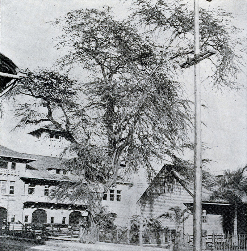 This photo of Father Bachelot’s kiawe tree, taken around 1902, was published in 1927 in the book “History of the Catholic Mission in Hawaii” by Sacred Hearts Father Reginald Yzendoorn.
