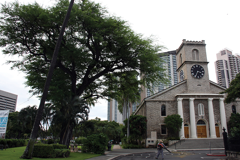 The kiawe tree in the yard of Kawaiahao Congregational Church Oct. 8, which grew from a seed from the original kiawe tree in the Catholic mission on Fort Street planted by Sacred Hearts Father Alexis Bachelot, Hawaii’s first Catholic missionary. (HCH photo | Patrick Downes)