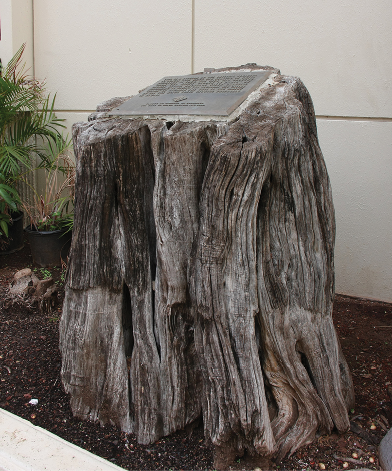The stump of Father Bachelot’s kiawe tree stands on the makai side of the diocese’s chancery building Oct. 8. (HCH photo | Patrick Downes)