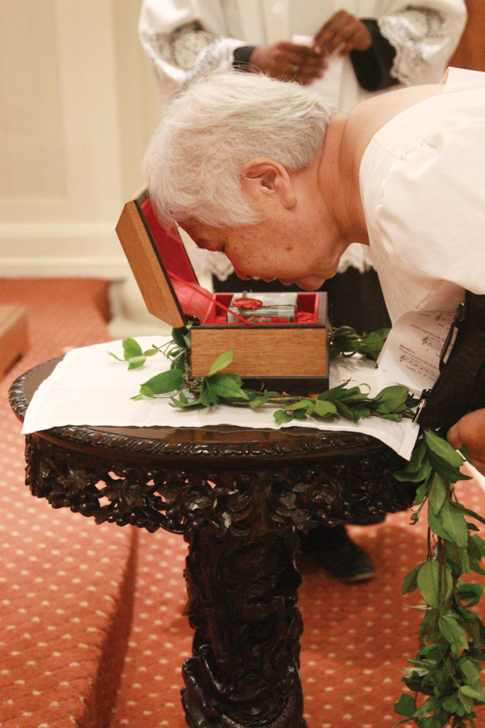 Bishop Silva gave the final blessing using the Damien relic, a bone from the saint’s foot, to trace the sign of the cross over the congregation.