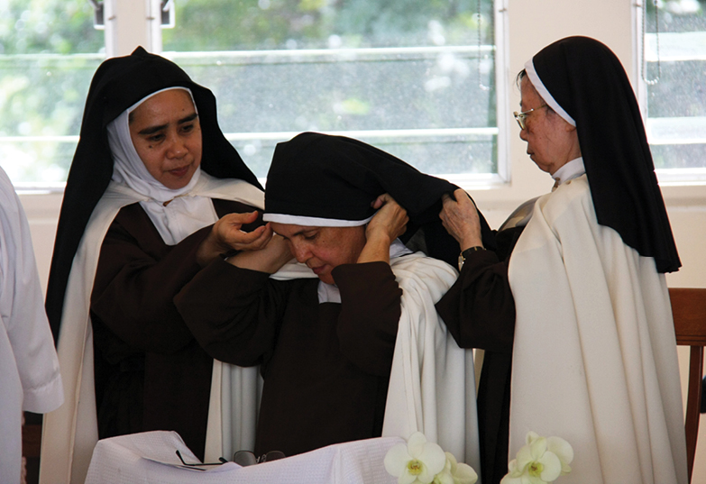 Sister Liza Sado, left, and Mother Agnella place the Carmelite’s veil on the head of Sister Mary Elizabeth. (HCH photo | Patrick Downes)