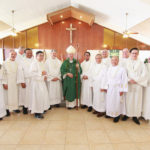 Deacon candidates received the rite of acolyte at Mass at St. Stephen Diocesan Center’s chapel on Oct. 13. It is the last formal step before their permanent diaconate ordination in early 2021. They are pictured here with Bishop Larry Silva. (Photo courtesy Dann Ebina.)