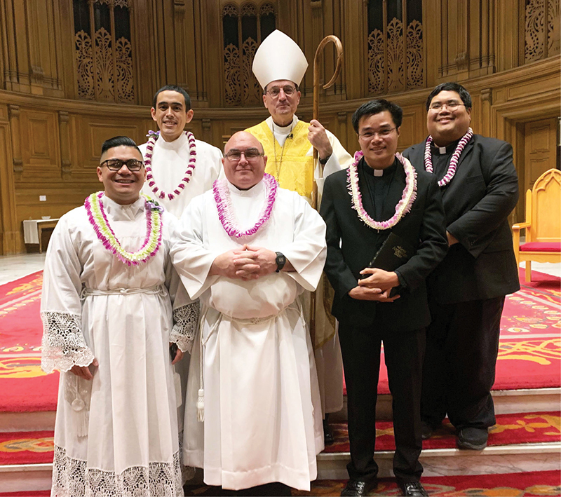 Two Diocese of Honolulu seminarians were installed as lectors and three as acolytes in a ceremony Nov. 6 celebrated by Bishop Joseph Brennan of the Diocese of Fresno, center, at St. Patrick’s Seminary in Menlo Park, California. The acolytes, dressed in albs, from left are Preston Castro, Arrion Llantos and Kevin Clark. The lectors, in suits, from left, are Hai Pham and Kurt Meyer. The designation of lector, or reader at liturgies, and acolyte, one who assists at the altar, are among the final formal steps to ordination. (Photo courtesy of Ace Tui)
