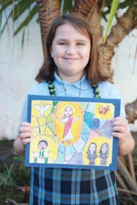 Grace Delehanty, fifth grader at St. Anthony School, Kailua, the first place winner in the third-fifth grade category with her artwork “Jesus Calls Us.”