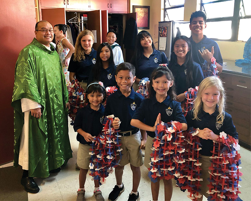 The students of Holy Family Catholic Academy and Early Learning Center in Honolulu strung more than 300 red, white and blue paper leis to be presented to all former and active duty military servicemen and servicewomen and their families who attended special Masses in their honor at 8:30 a.m. and 11 a.m. on Sunday, Nov. 10, at Holy Family Church in celebration of Veterans Day, Nov. 11. (Photo courtesy of April Moses)