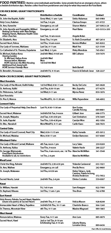 The diocesan Office for Social Ministry has placed Hawaii’s 36 parish food pantries into its “One Ohana: Food and Housing for All” initiative. Oahu has 20 pantries. Maui has four. So does Kauai and both east and west Big Island. Molokai has one emergency pantry.