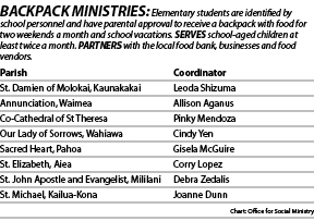 According to Leoda Shizuma, who coordinates Molokai’s backpack program, the parish works with four public and one private elementary schools to fill 125-150 backpacks with food twice a month.