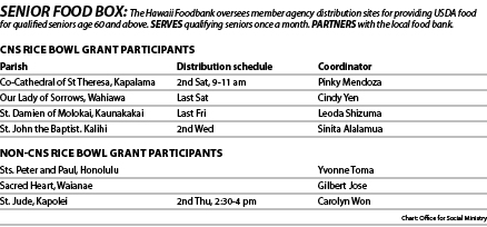 It’s a government program for low-income seniors and doesn’t cost the parish anything. The seniors receive “good portions” of cereal, orange juice, vegetables, canned fruit, rice. Because it is provided by the USDA, “it’s pretty healthy stuff,” said Tamashiro. “No Spam. No ramen.”