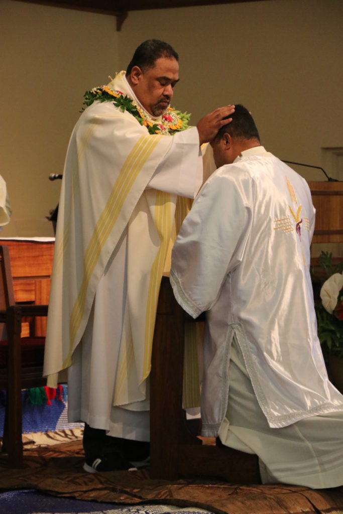 Then came the laying on of hands on his head by Bishop Silva, by which, accompanied by the invisible outpouring of the Holy Spirit, Deacon Niuliki became Father Niuliki.