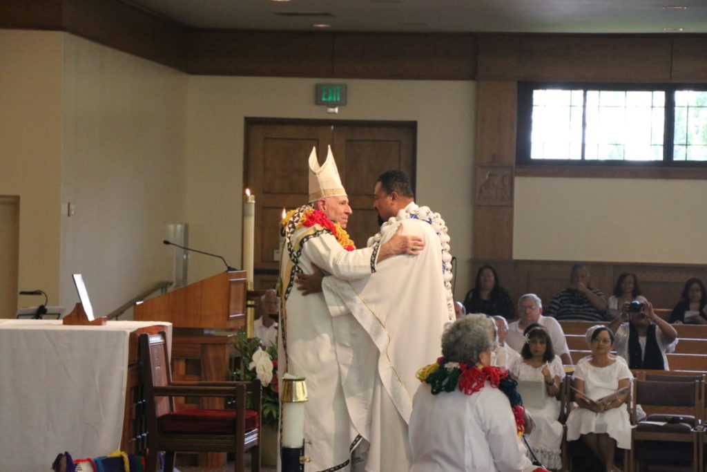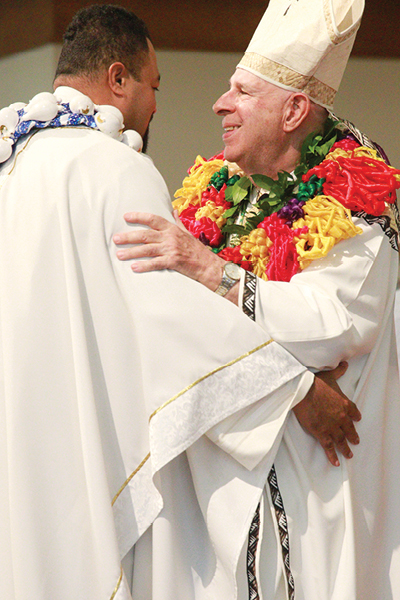 Bishop Silva and Father Niuliki embrace after his ordination rites. (Photo courtesy Dann Ebina)