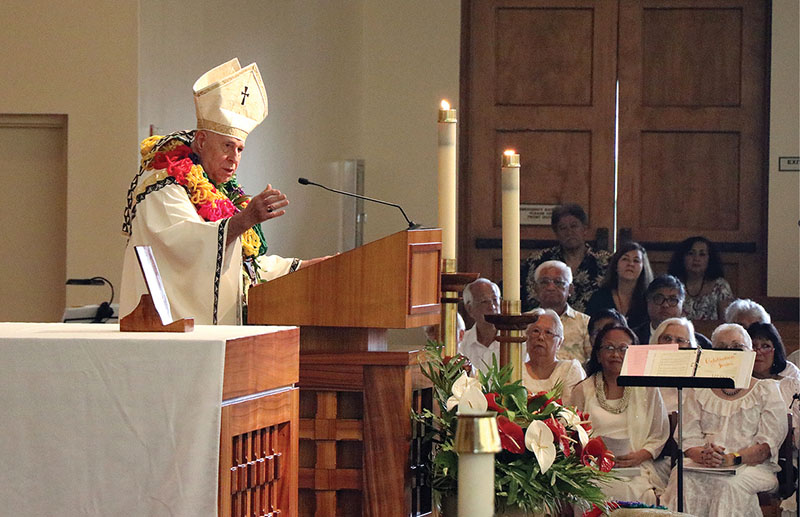 The bishop pointed them out: the Sacred Hearts Fathers, Brothers and Sisters who brought the faith to Hawaii and under whose care Deacon Niuliki had trained, the priests and deacons of the diocese who supported him, the “dear people of St. Ann Parish” whom he served as deacon and “who have played a special role” in his formation, and his “beautiful family” who served as “instruments of God, giving you life and nurturing that life in wisdom and love.”