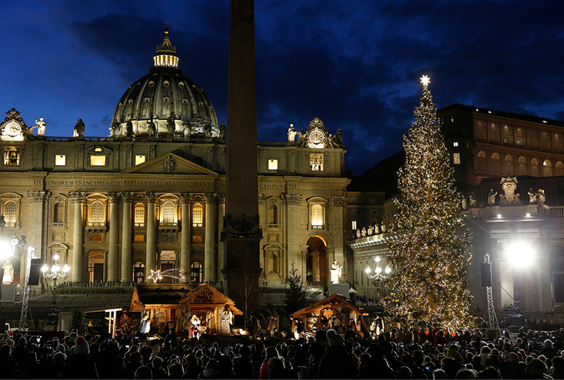 The large Nativity scene in St. Peter’s Square was made entirely out of wood and replicates traditional northern Trentino-style buildings.