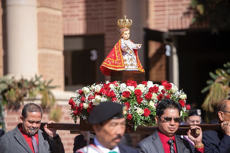 Men carry a statue of Santo Nino de Cebu, who is depicted as the Infant Child Jesus, during a special Mass honoring the popular Filipino devotion to the Child Jesus at Mary Queen Catholic Church in Friendswood, Texas, Jan. 4, 2020. The devotion originates from Cebu City, Philippines, and was brought over by Filipino immigrants. A special reception followed the Mass that featured traditional Filipino dances and the Sinulog dance. (CNS photo/James Ramos, Texas Catholic Herald)