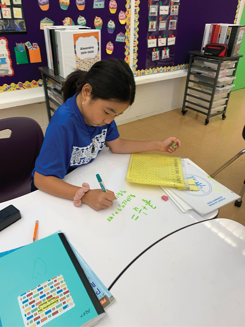 Yes, please write on the desk. A student at Our Lady of Good Counsel School in Pearl City figures out a math problem on her 21st century desk. (Photo courtesy Augustine Educational Foundation)