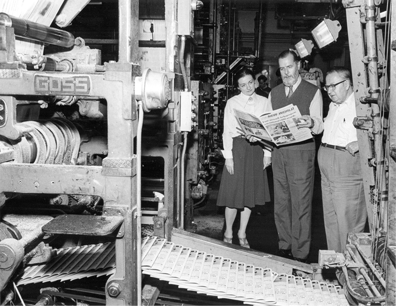 A.E.P. “Ed” Wall, center, then-editor of Chicago’s archdiocesan newspaper, looks over an issue coming off the press in this 1977 Chicago Catholic file photo. He also was a former editor-in-chief of Catholic News Service. (CNS photo/Chicago Catholic)