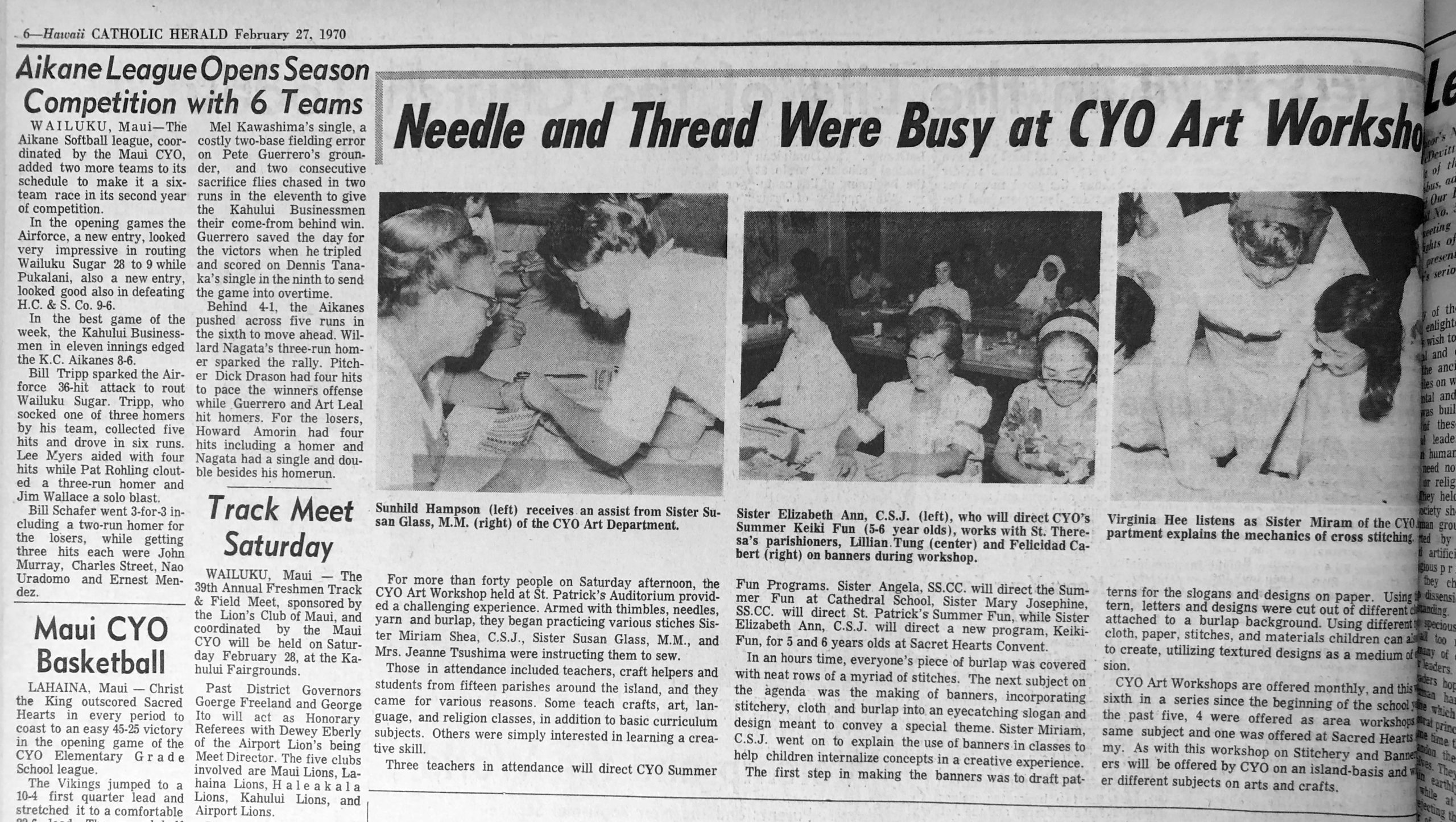 For more than forty people on Saturday afternoon, the CYO Art Workshop held at St. Patrick’s Auditorium provided a challenging experience. Armed with thimbles, needles, yarn and burlap, they began practicing various stitches…Those in attendance included teachers, craft helpers and students from fifteen parishes around the island…Some teach crafts, art, language, and religion classes, in addition to basic curriculum subjects. Others were simply interested in learning a creative skill.