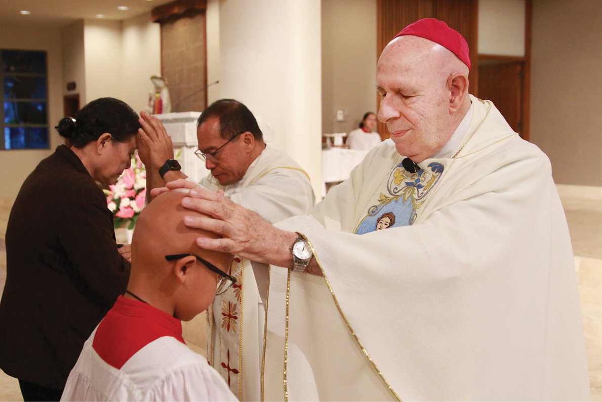 Bishop Larry Silva imparts a blessing on an altar server during Mass for the World Day of the Sick, Feb. 11, the memorial of Our Lady of Lourdes, at the Co-Cathedral of St. Theresa. The liturgy included the sacrament of the Anointing of the Sick for those seriously ill. The Order of Malta, Honolulu Auxiliary of the Western Association U.S.A., who have a special ministry to the sick, hosted the event. (Photo courtesy of Dann Ebina)