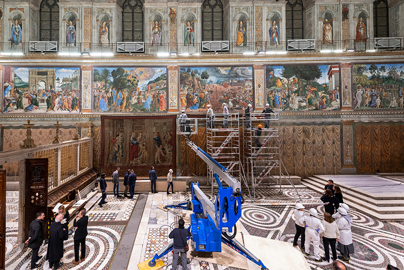 Tapestries designed by Renaissance master Raphael are placed on a lower wall in the Sistine Chapel at the Vatican Feb. 16, 2020. Ten enormous tapestries by Raphael were on display for one week in celebration of the 500th anniversary of his death in 1520. (CNS photo/courtesy of Vatican Museums)