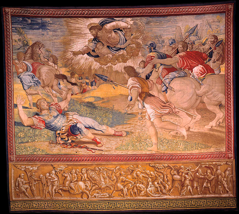 The tapestry “The Conversion of Saul” by Renaissance master Raphael is pictured in this undated photo. Ten enormous tapestries by Raphael were on display in the Sistine Chapel for one week in celebration of the 500th anniversary of his death in 1520. (CNS photo/courtesy of Vatican Museums)